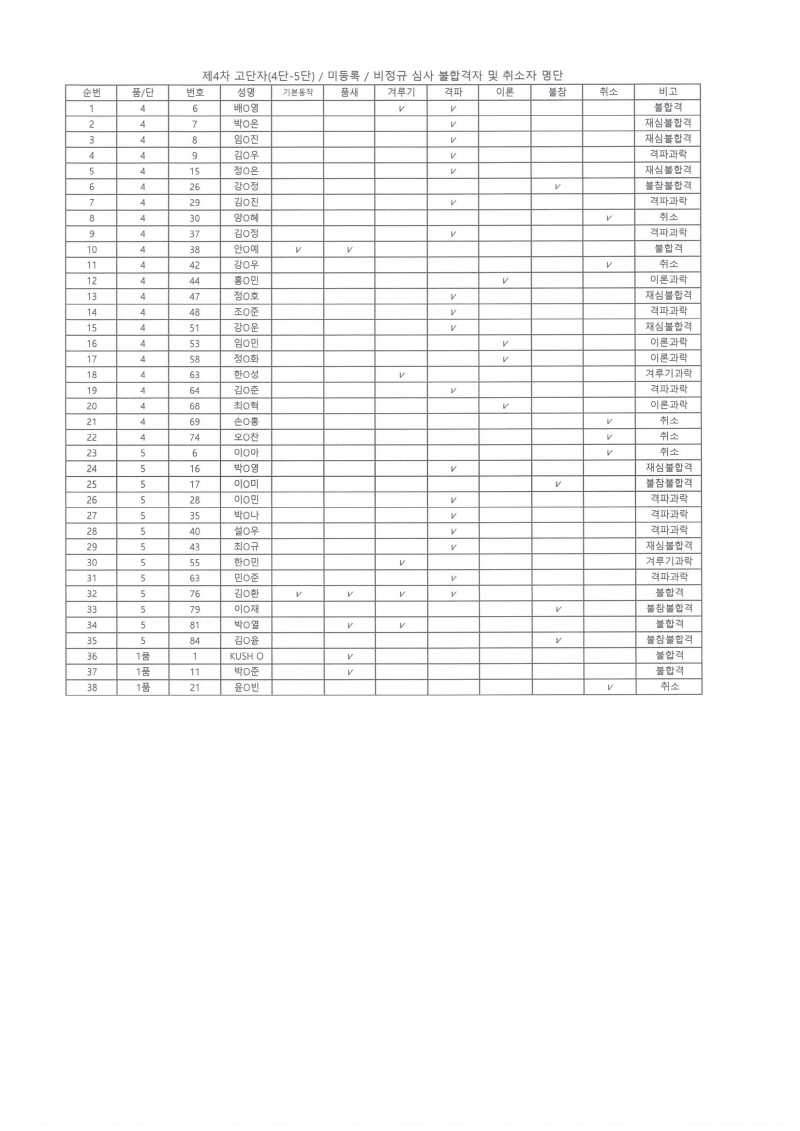 2025년 제4차 4-5단 및 미등록, 학교 심사 불합격자 및 취소자 명단(2025.11.01 국기원)