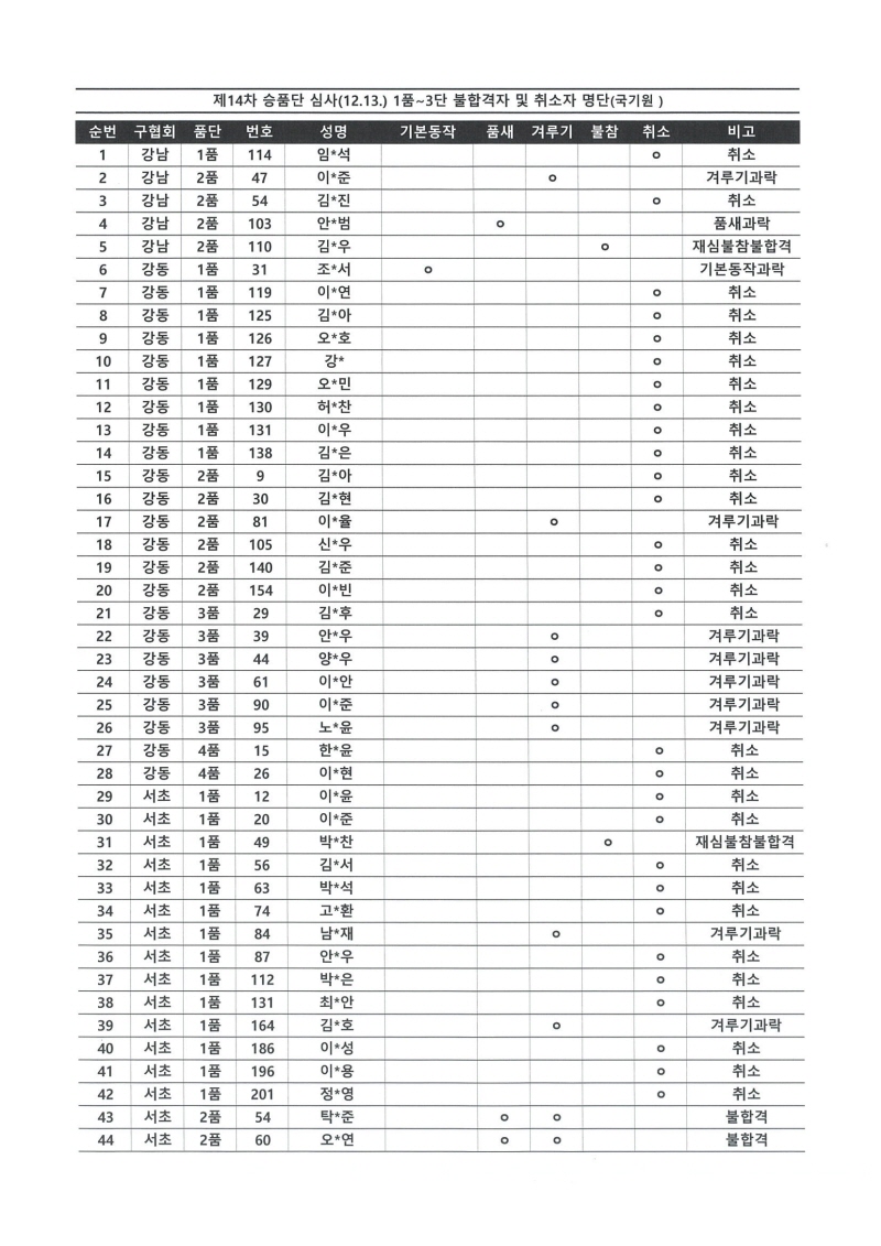 제14차 승품단 심사(12.13) 불합격자 및 취소자 명단(국기원)