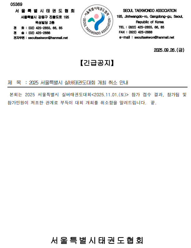 2025 서울특별시 실버태권도대회 개최 취소 안내