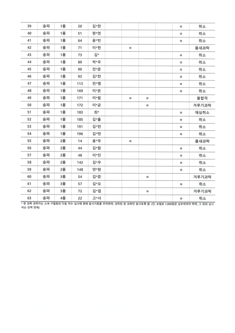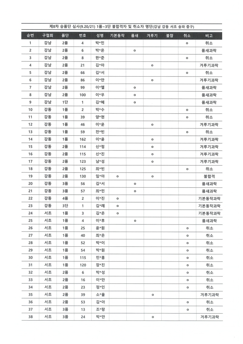 제8차 승품단 심사(9.20/21) 불합격자 및 취소자 명단(강남 강동 서초 송파 중구)