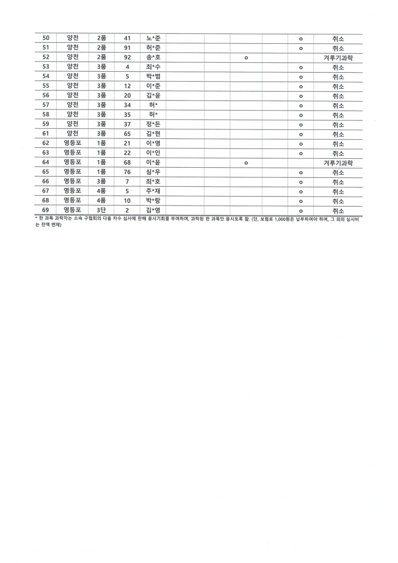 제1차 승품단 심사(2.8.) 불합격자 및 취소자 명단(가양레포츠센터)