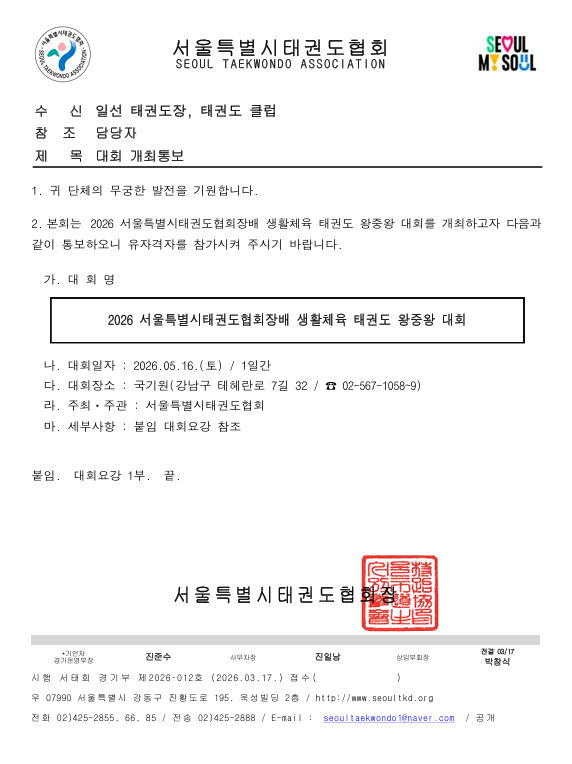 2026 서울특별시태권도협회장배 생활체육 태권도 왕중왕 대회 개최 통보
