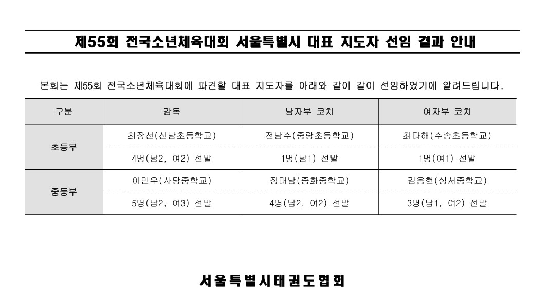 제55회 전국소년체육대회 서울특별시 대표 지도자 선임 결과 안내