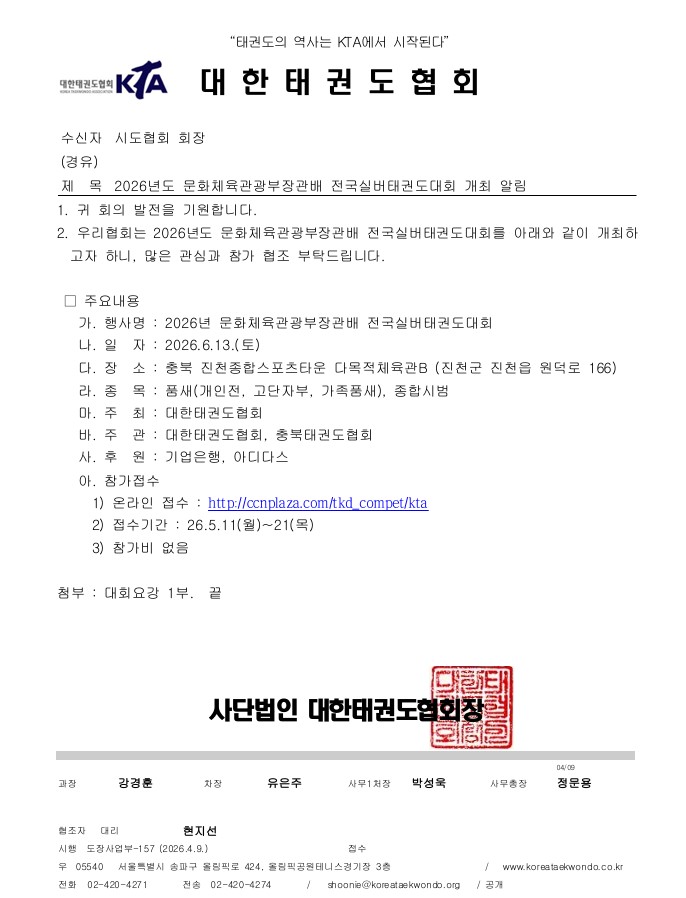 2026년도 문화체육관광부장관기 전국실버태권도대회개최 안내